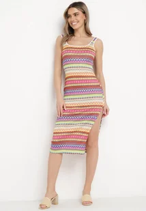 Różowo-Pomarańczowa Dopasowana Sukienka Midi na Ramiączkach z Elastycznej Dzianiny Dempnia