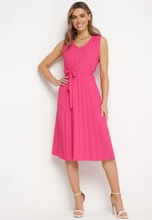 Fuksjowa Rozkloszowana Sukienka Midi Plisowana z Materiałowym Paskiem Varethia