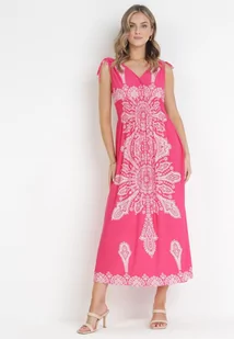 Fuksjowa Sukienka w Stylu Boho z Gumką w Talii i Sznurkami przy Ramionach Niree