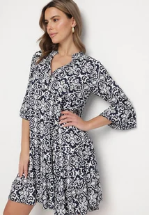 Granatowa Bawełniana Sukienka Rozkloszowana z Falbanką w Ornamentalny Wzór Laneloren