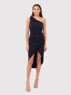 Granatowa drapowana sukienka midi na jedno ramię DA1770 NAVY Elastyczna sukienka midi na jedno ramię. Kolor granatowy z bocznym zamkiem błyskawicznym, drapowaną górą i drapowaną spódnicą. Materiał wykonania ...