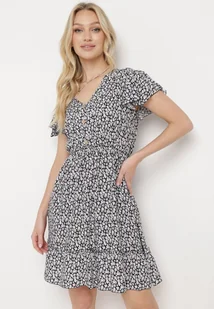 Czarno-Biała Sukienka Bawełniana z Gumką w Pasie i Drobnym Wzorem w Kwiaty Napenia