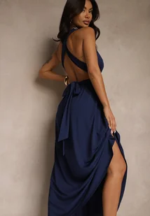 Granatowa Koktajlowa Sukienka Multiway z Wiskozą i Wiązaniem na Szyi Lilazza