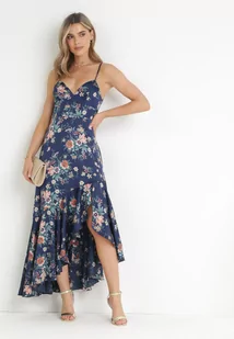 Granatowa Sukienka Maxi na Cienkich Ramiączkach z Asymetrycznym Dołem Nylas
