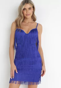 Granatowa Sukienka Mini na Regulowanych Ramiączkach Zdobiona Frędzlami Tristi