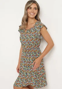 Granatowo-Niebieska Bawełniana Sukienka w Kwiaty z Gumką w Talii i Falbanką Dimllara