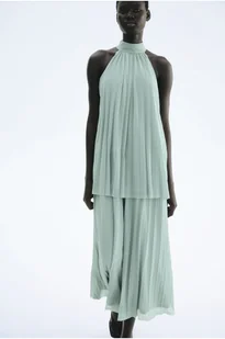 Długa sukienka bez rękawów wykonana z plisowanego dżerseju. Krój o warstwowym wyglądzie. Stójka, na karku niewielkie rozcięcie z obciąganymi guzikami. Z podszewką.
