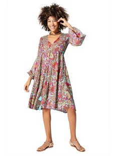 Sukienka w kolorze turkusowo-różowym - dekolt: V - talia: elastyczna - detale: ozdobne wiązanie - krój: taliowany - wzór: na całości Uwaga: