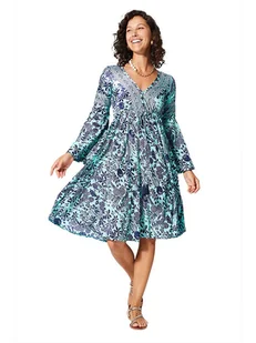 Sukienka w kolorze turkusowym - dekolt: V - talia: elastyczna - długość rękawa: długi - krój rękawów: rozszerzany do dołu - krój: dłuższe plecy - wzór: