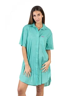Sukienka w kolorze turkusowym - czysta bawełna - kołnierz: kent - zapięcie: listwa guzikowa - kieszenie: na piersi - dolny brzeg: zaokrąglony - detale: haft - krój: prosty - look: jednokolorowy