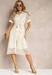Jasnobeżowa Koronkowa Sukienka Koszulowa z Krótkim Rękawem i Wiązanym Paskiem Noralia