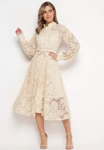 Jasnobeżowa Koronkowa Sukienka Midi z Wiązanym Paskiem Azraella