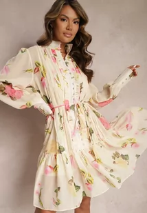 Jasnobeżowa Plisowana Sukienka Midi z Kwiatowym Wzorem z Paskiem i Guzikami Jazai