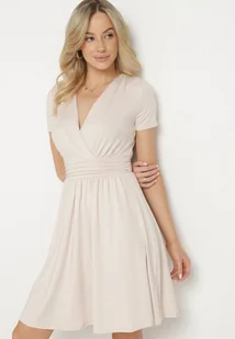 Jasnobeżowa Rozkloszowana Sukienka z Wiskozą o Kopertowym Kroju z Marszczeniem Adivas