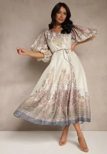Jasnobeżowa Rozkloszowana Sukienka z Wiskozy z Wiązaniem i Ornamentalnym Wzorem Redanira
