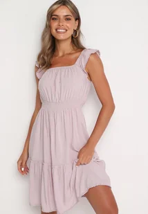 Jasnofioletowa Taliowana Sukienka z Wiskozą i Bawełną Falbankami oraz Gumką w Talii Hemvia