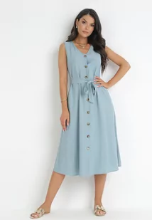 Jasnoniebieska Trapezowa Sukienka z Wiązanym Paskiem Brystia