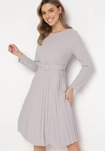 Jasnoszara Sukienka Midi z Plisowaną Spódnicą i Paskiem Ondinetta