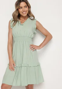 Jasnozielona Sukienka z Wiskozą o Rozkloszowanym Kroju Bez Rękawów Folerose