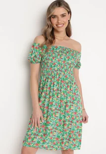 Jasnozielona Sukienka z Wiskozy w Kwiaty z Hiszpańskim Dekoltem Latiana