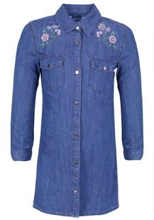 Jeansowa, niebieska sukienka - koszula na długi rękaw. Sukienka posiada klasyczny kołnierzyk. Z przodu zapięcie na zatrzaski, u góry wyhaftowany kwiatowy wzó...