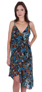 Śliczna, lekka i zwiewna sukienka w kolorowe motyle, z dekoltem w szpic oraz gumką w pasie. Bardzo kobieca, o asymetrycznym kroju. Z podszewką, do połowy uda...