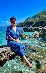 Kimono długie onesize (długość do połowy łydki) uszyte z tkaniny wiskozowej w ręcznie malowany wzór turkusowa RAFA KORALOWA KOLOR na żywo jest super twarzowy i robi efekt wakacyjnej opalenizny, odcień b ...