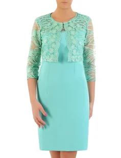 Zapraszamy do odkrycia naszego turkusowego kompletu, który łączy elegancję koronki z prostotą klasycznej tkaniny. Delikatny żakiet z koronki o długości 3/4 rękawa jest prawdziwą ozdobą tego zestawu, a jego przejrzystość pięknie komponuje się z barwą sukienki. Sukienka wyróżnia się ozdobną górą oraz pionowymi zaszewkami, które optycznie wyszczuplają sylwetkę, nadając jej smukły kontur. Prosty fason sukienki sprawia, że jest ona zarówno wygodna, jak i stylowa, idealna na różne okoliczności. Ta wyjątkowa kreacja, z domieszką koronkowej delikatności, sprawdzi się doskonale zarówno na dzień, jak i
