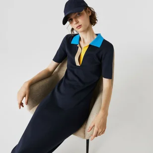 Lacoste Damska Długa Dwukolorowa Sukienka Sweterkowa Z Dzianiny Bawełnianej Z Kołnierzem Polo