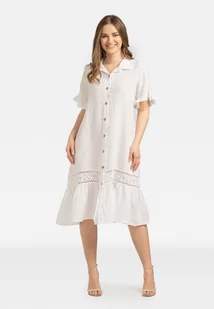 Lekka lniana sukienka damska z koronką Lniana biała sukienka z koronką to idealna opcja na wiosnę i lato. Góra sukienki uszyta jest na bazie koszuli z kołnie...