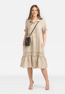 Lekka lniana sukienka damska z koronką Lniana beżowa sukienka z koronką to wyjątkowy model, który świetnie sprawdzi się podczas lata. Górna część sukienki pr...