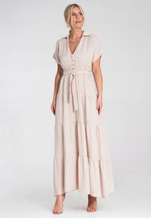 Beżowa sukienka maxi z kołnierzykiem i krótkim rękawem to idealne połączenie stylu i wygody. Model w stylu boho przyciąga uwagę delikatnymi guzikami oraz wią...