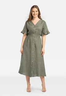 Lniana sukienka damska midi z guzikami Jeżeli szukasz idealnej sukienki na lato, to lniana sukienka midi z guzikami w kolorze khaki będzie dokładnie tym, cze...
