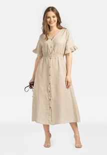 Lniana sukienka damska midi z guzikami Lniana beżowa sukienka midi z guzikami to propozycja, która dzięki naturalnemu materiałowi, sprawdzi się idealnie na u...