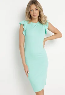 Miętowa Dopasowana Sukienka Midi z Falbanką przy Rękawie Ekarra