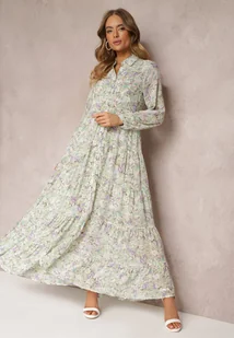 Miętowa Koszulowa Sukienka Maxi w Kwiaty z Falbaną na Dole Nilmisse - Renee