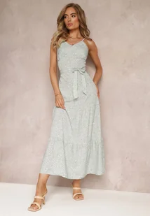 Miętowa Kwiecista Sukienka Maxi na Regulowanych Ramiączkach z Materiałowym Paskiem Phoebilu - Renee