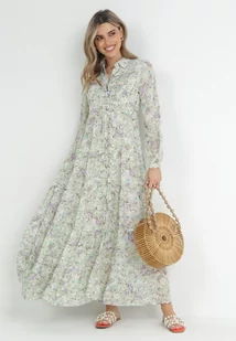 Miętowa Rozkloszowana Sukienka Koszulowa Maxi Zalest