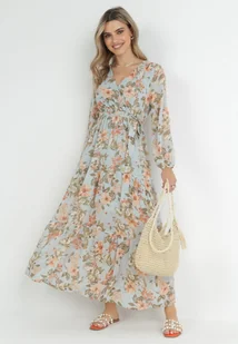 Sukienka Manirisa z górą w kopertowym stylu i długimi rękawami. Dodatkowo wiązana paskiem z tego samego materiału. Zdobiona wzorem w kwiaty. Sukienka posiada podszewkę. Gumka w pasie po rozciągnięciu mierzy: