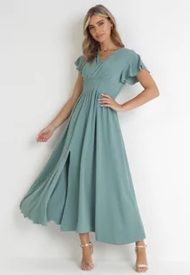 Miętowa Rozkloszowana Sukienka z Kopertowym Dekoltem Hanriette