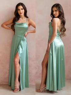 Taliowana sukienka, rozkloszowany krój. Dół sukienki z rozcięciem odsłaniającym nogę. Sukienka wykonana z atłasowego, grubszegomateriału, który nie prześwituje. Model posiada ramiączka, kryty zamek na plecach oraz rozcięcie. Idealnie skrojona, pięknie podkreśla figurę! Niezwykle seksowna i kobieca.