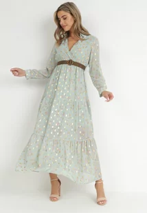 Miętowa Sukienka z Wiskozy w Etno Wzór z Gumką i Paskiem w Talii Lucassa