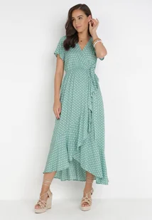 Sukienka Echosia o długości maxi, wykończona na dole falbaną. Fason kopertowy, wiązany w pasie na boku. Z krótkimi rękawami i głębokim dekoltem. Pokryta wzorem w kropki. W pasie elastyczna gumka.