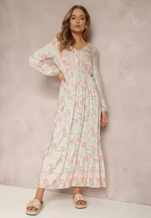 Sukienka Hyrope rozkloszowana, z długimi rękawami. Dekolt trójkątny, o klasycznej głębokości. Fason maxi, z falbaną na dolnej krawędzi. Z elastyczną gumką wszytą dookoła pasa. Góra koszulowa, zapinana na rząd guzików.
