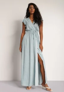 Sukienka Karmay ozdobiona wzorem w drobne kwiaty, o długości maxi. Z gumką w pasie, dodatkowo wstawiony został materiałowy pasek, który subtelnie podkreśla talię. Rękawy zakończone ozdobnymi falbankami. Bez podszewki, z głębokim, kopertowym dekoltem. Gumka w pasie po rozciągnięciu wynosi: