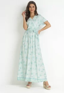 Miętowa Sukienka Kopertowa z Wiskozy z Gumką w Talii i Metalicznym Wzorem Hollisa