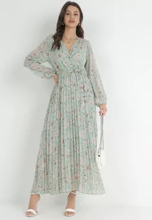 Miętowa Sukienka Maxi z Gumką w Talii i Plisowanym Dółem Danora