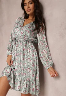 Sukienka Meridarah o długości mini, z rozkloszowanym dekoltem oraz falbanką u dołu. Z głębokim, kopertowym dekoltem i długimi rękawami ze zwężeniem. W talii wszyta została gumka podkreślająca wcięcie, dodatkowo dołączono materiałowy pasek, którym wyeksponujesz talię. Pokryta wzorem w kwiaty, z wtłoczoną metaliczną nicią. Z podszewką.