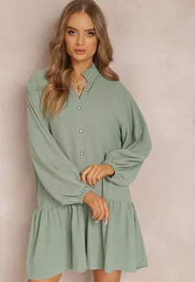 Sukienka Oromeda mini, o pudełkowym fasonie, z falbaną na wysokości bioder. Długi rękaw ze ściągaczem i lekką bufką. Wykonana z gładkiej tkaniny, utrzymanej w jednolitej kolorystyce. Przy szyi stójka. Bez podszewki.
