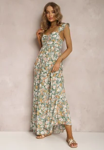 Sukienka Phaelothee to rozkloszowany fason o długości maxi. Z falbanką na dole. Posiada szerokie, marszczone za pomocą elastycznej gumki ramiączka. Biust eksponuje głęboki, trójkątny dekolt. Pod dekoltem przeszycie i dekoracyjna ażurowa lamówka, jak wokół ramiączek, Pokryta wzorem w kolorowe kwiaty.